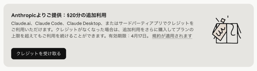 【4月17日まで】Anthropicから20ドル分の追加使用量をもらう