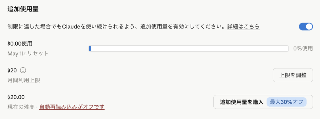Anthropicには、この「追加使用量」をユーザーに20ドル払ってでもオンにしてもらい、どんどん上限を超えて(つまり、追加使用量を払って)使ってもらいたい、という意図があるんでしょう。