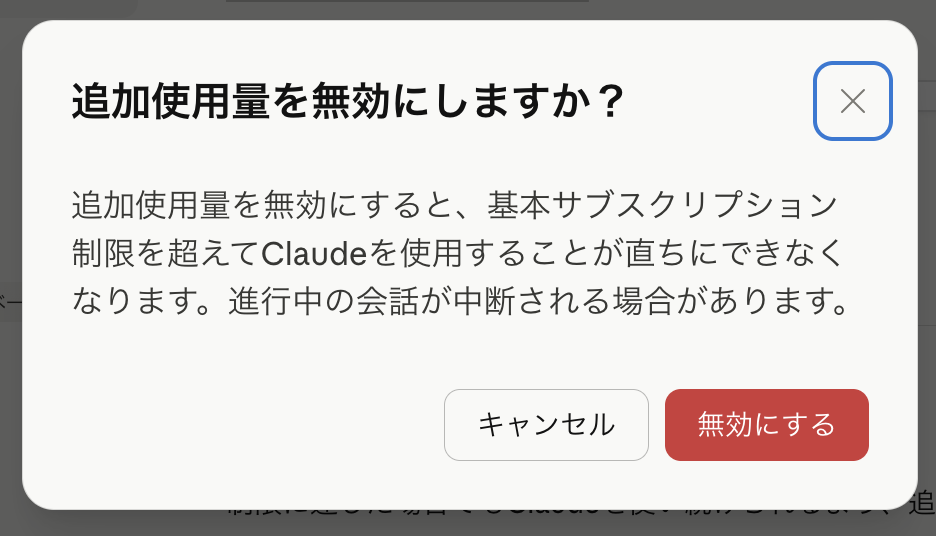 ちなみに「追加使用量」をオフにすると、この機能自体を無効にできるみたいです。