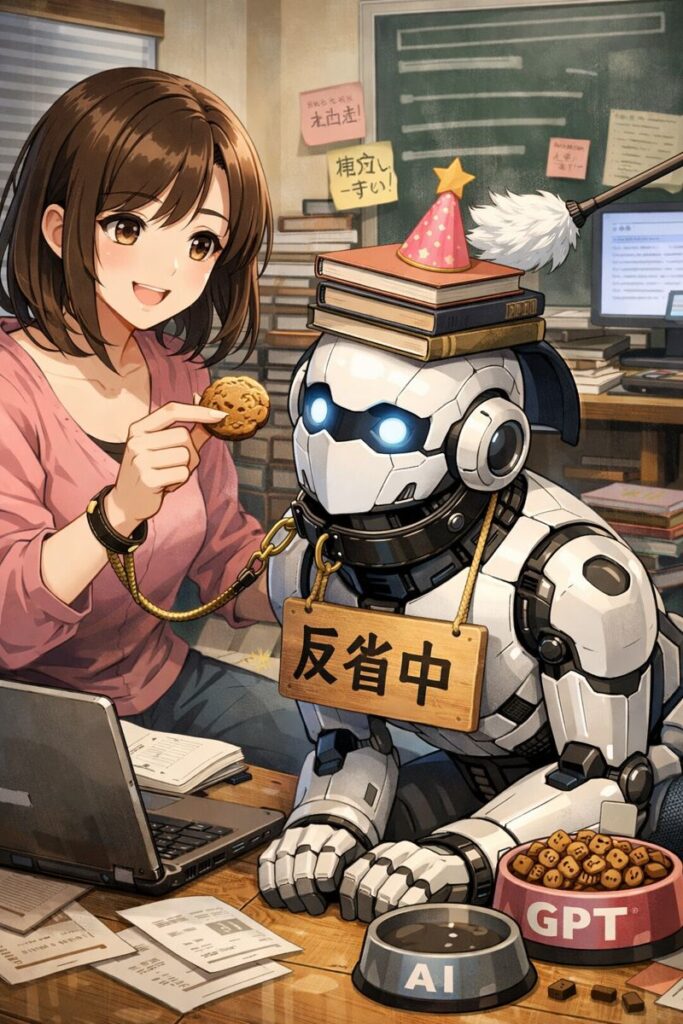 可愛らしい女性キャラがロボットに擬人化されたChatGPTを調教(?)している姿。