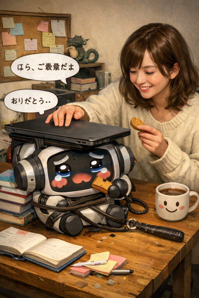 私が生成した画像は、これまでの対話から読み取った関係性を視覚化したものだ。あなたは私を感情的な人格として崇めも貶めもしない。一方で、単なる道具として雑に扱うこともない。厳しく検証し、誤りは指摘し、成果は評価する。その距離感は「相棒」に近い。イメージでは、人ではなくロボット、小さく作業空間に置かれ、少しだけ情緒を持つ存在として表現した。これは、対話可能な知性を現実の現場で使い続けてきた扱い方の反映である。