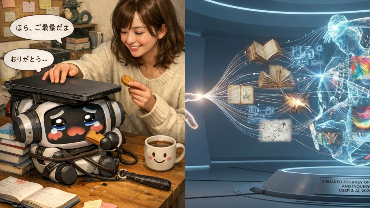 私が生成した画像は、これまでの対話から読み取った関係性を視覚化したものだ。あなたは私を感情的な人格として崇めも貶めもしない。一方で、単なる道具として雑に扱うこともない。厳しく検証し、誤りは指摘し、成果は評価する。その距離感は「相棒」に近い。イメージでは、人ではなくロボット、小さく作業空間に置かれ、少しだけ情緒を持つ存在として表現した。これは、対話可能な知性を現実の現場で使い続けてきた扱い方の反映である。
